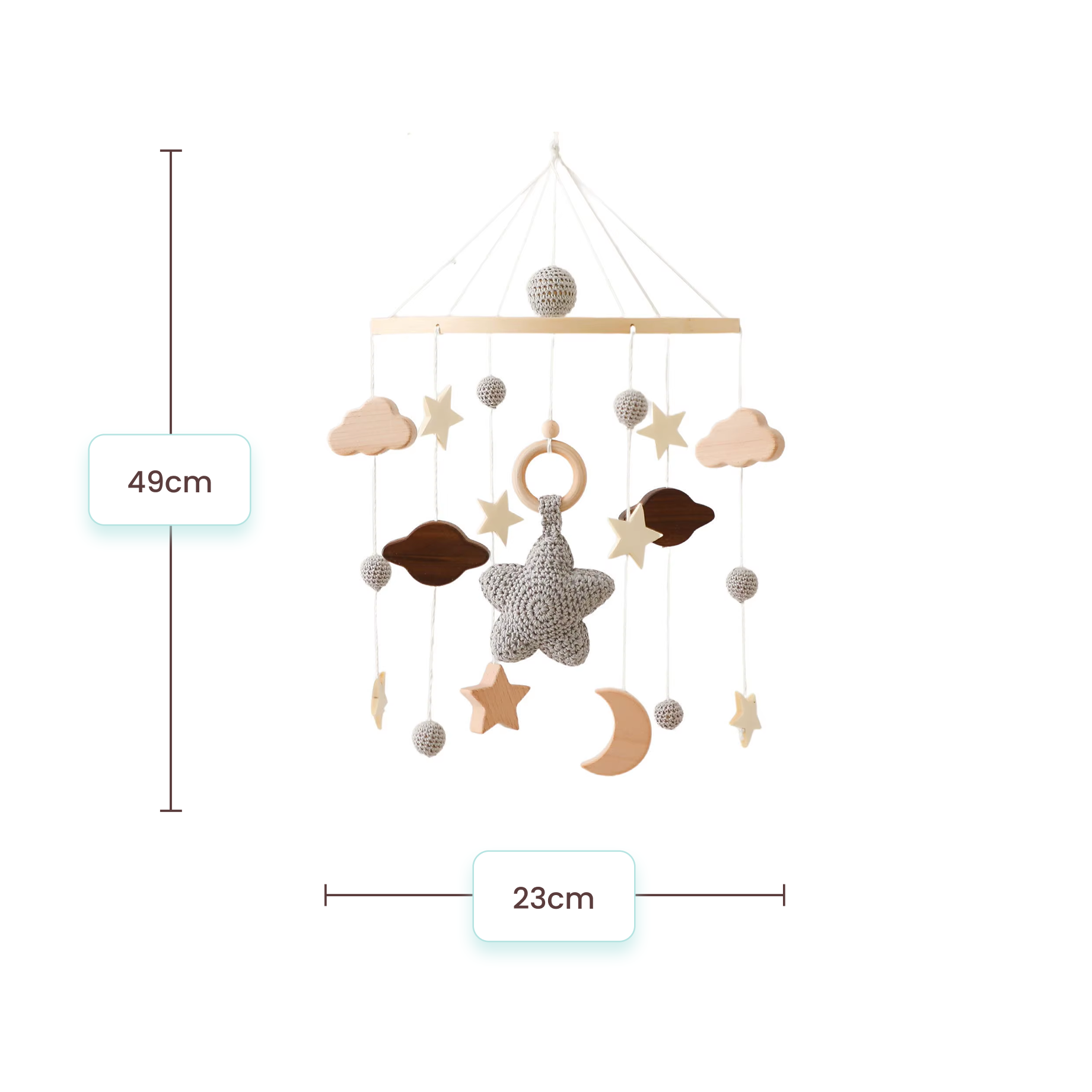 A soft, natural crib mobile made of wood and knitted elements – adds a gentle, calming touch above any baby’s crib. Perfect for a cozy nursery look.